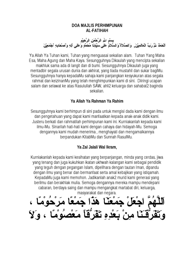 Doa sempena perhimpunan jabatanorganisasi SlideShare uses cookies to improve functionality and performance and to provide you with relevant advertising. Jadikanlah kami hamba-hamba-Mu yang sentiasa bersyukur sama ada nikmat yang sedikit lebih-lebih lagi nikmat yang melimpah ruah kepada kami. Berikut adalah teks baca doa majlis perhimpunan rasmi atau tidak rasmi seperti untuk pembukaan program di awal pagi di sekolah perhimpunan keluarga jabatan di tempat kerja dan sebagainya.
