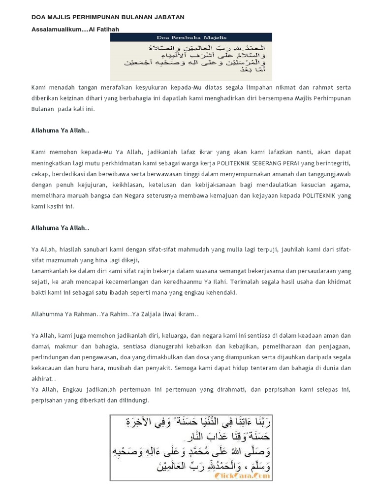 Doa majlis perhimpunan mesyuarat 1. Shamsuhair Last modified by. Ia sesuai digunakan untuk majlis yang dihadiri ramai orang termasuklah perhimpunan sekolah asrama kolej universiti dan juga jabatan kementerian.